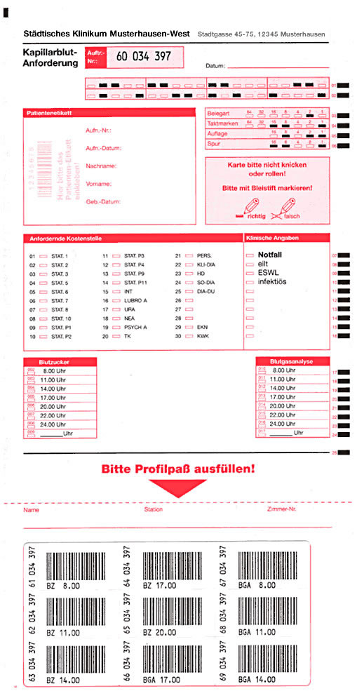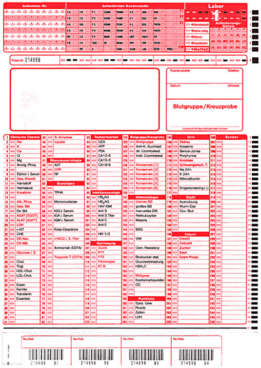 Hier sehen Sie vier Beispiele für die Konzeption medizinischer Laborformulare mit und ohne Barcode-Etikettierung.Die Formulare werden nach den spezifischen Anforderungen der Einrichtungen gestaltet.